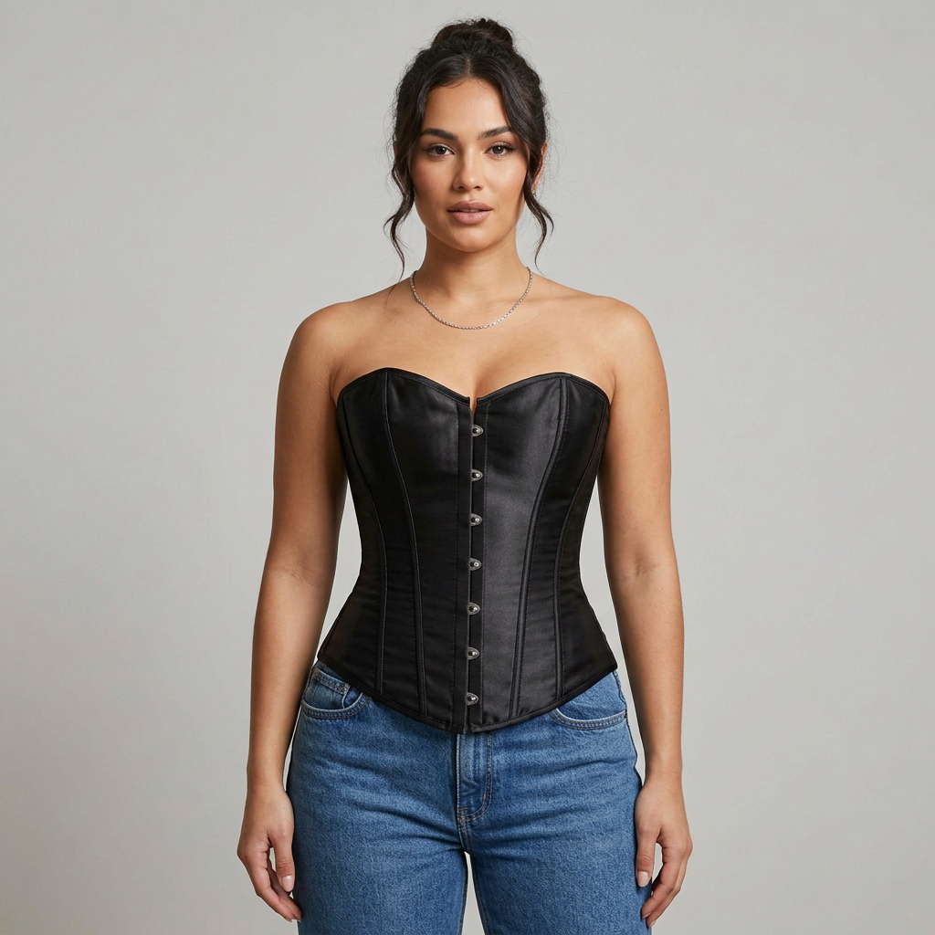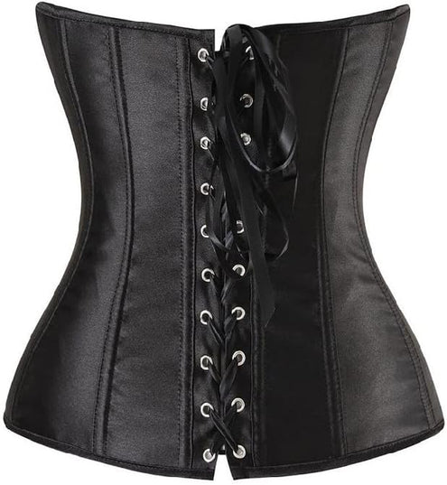 Corselet em tecido acetinado confeccionado com qualidade. Possui acabamento em viés. Abertura com busk (peça firme de encaixe) e com amarração nas costas que facilita o ajuste e valoriza o corpo e postura.